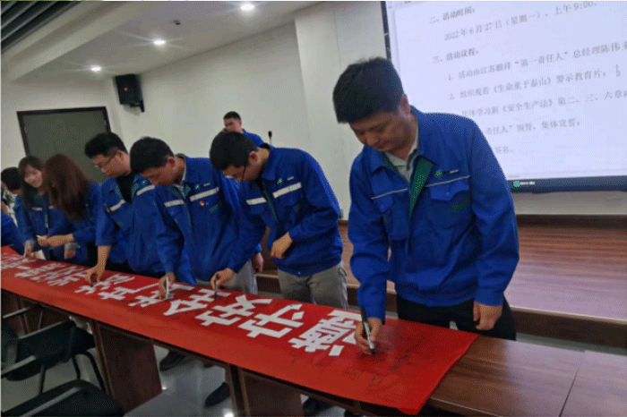 麒祥新材料全體員工紛紛在“遵守安全生產(chǎn)法 當(dāng)好責(zé)任人”的安全生產(chǎn)月活動主題橫幅上鄭重簽名,莊嚴(yán)宣誓承諾。