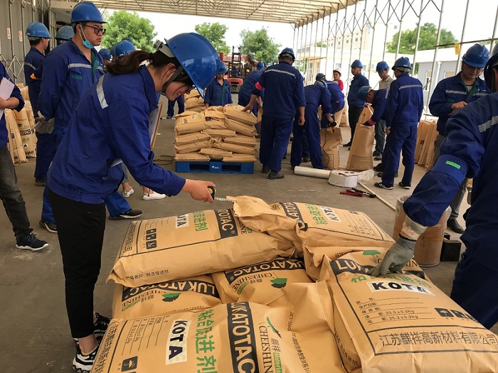 生產(chǎn)組的比賽設(shè)在了倉庫門口,比賽過程緊張而激烈,稱重、縫包、打托、纏膜,班組成員熟練而有序地完成這一系列的操作,無需多言,拼的就是平時(shí)工作的默契。