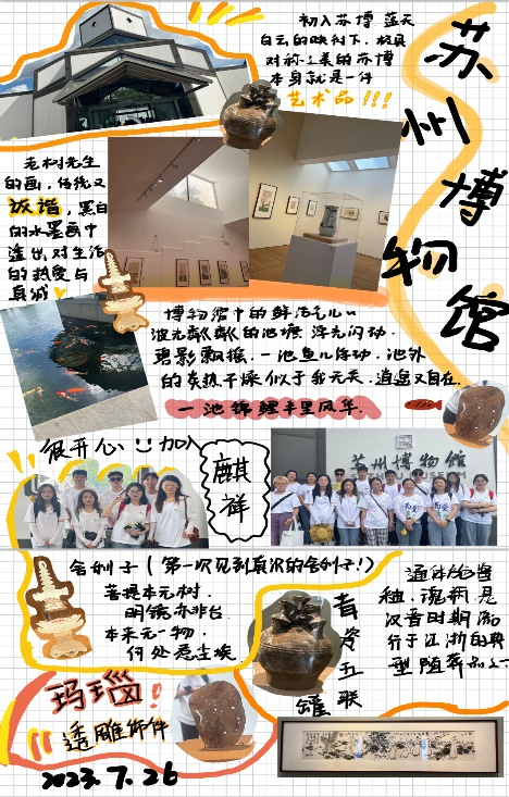 在專業(yè)知識(shí)熟練運(yùn)用的同時(shí),要補(bǔ)全“短板”,德、智、體、美、勞全面發(fā)展,為公司事業(yè)的蓬勃發(fā)展貢獻(xiàn)自己的智慧和力量。培訓(xùn)營的第三天,為了提高新人的美學(xué)修養(yǎng),公司新人一同參觀了蘇州博物館并制作了自己的美學(xué)報(bào)告,報(bào)告形式多樣,展示了新人對(duì)蘇博的見解。